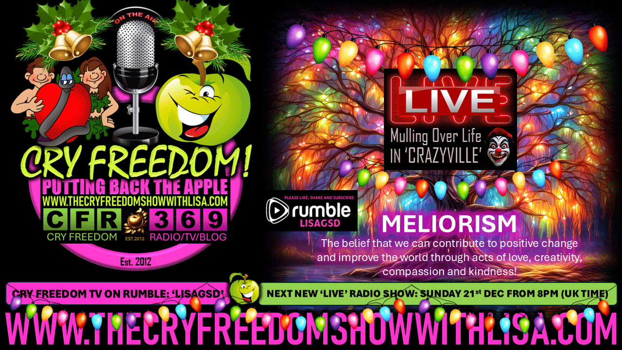 There are regular additions to CRY FREEDOM TV on RUMBLE including my monthly chats with ALAN JAMES of CIRCLE OF WHITE LIGHT RADIO/TV, where we do our 'MULLING OVER LIFE IN CRAZYVILLE' discussions and video updates from myself!